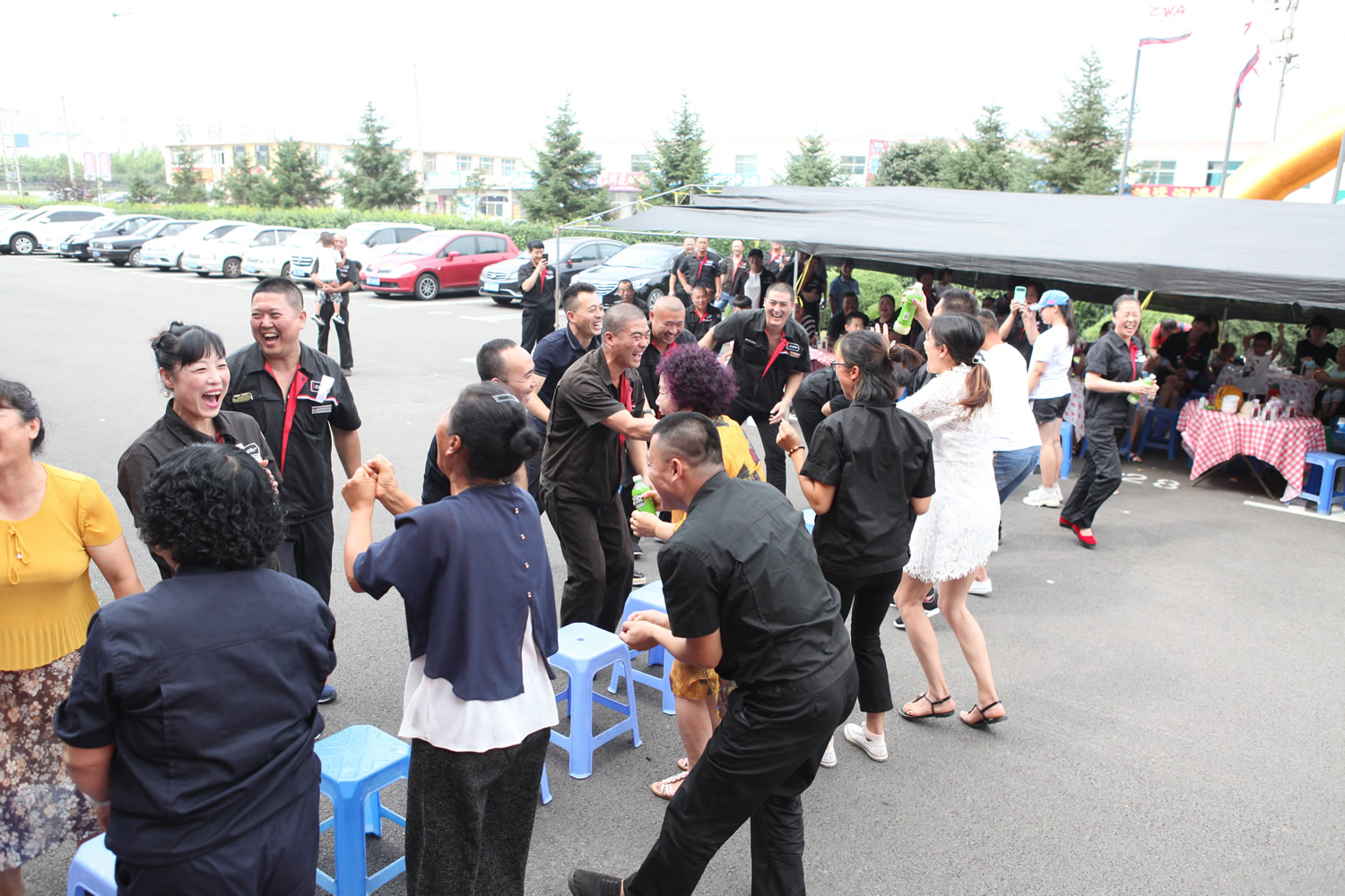 活動現(xiàn)場為家屬們準備了游戲環(huán)節(jié):搶凳子、你來比劃我來猜、搶飲料、背靠背夾氣球跑等娛樂項目,氣氛非常熱烈。