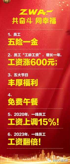 然而,在“裁員降薪”的洪流中,ZWA卻成為了為數不多的逆行者:公司決定從2020年3月份起,將所有一線員工的工資上調15%!這是ZWA的底氣!更是ZWA的擔當!